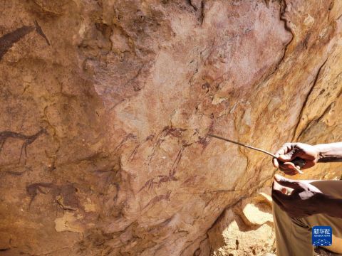 在南部非洲国家博茨瓦纳最东端的图利自然保护区,有20多处土著桑人留下的岩画,距今已有1800多年,成为当地著名的人文景观。这些岩画多为动物,有长颈鹿、大象、羚羊、狒狒、豺狼、食蚁兽等,也有表现桑人生活的画面,如人群跳舞、聚会等场景。岩画大小不一,大的约有30厘米高,小的约有5厘米高。 新华社记者 滕军伟 摄