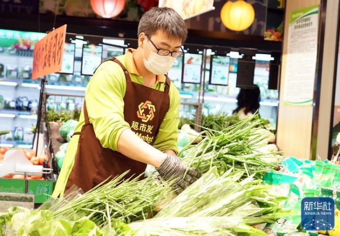 ↑5月13日,在位于北京市海淀区的超市发双榆树店,工作人员摆放蔬菜。新华社记者 任超 摄