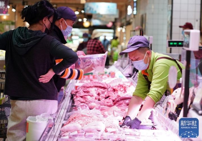 ↑5月13日,在位于北京市海淀区的超市发双榆树店,市民挑选鲜肉。新华社记者 任超 摄