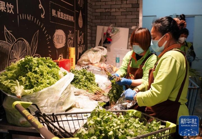↑5月13日,在位于北京市海淀区的超市发双榆树店,工作人员包装蔬菜。新华社记者 任超 摄