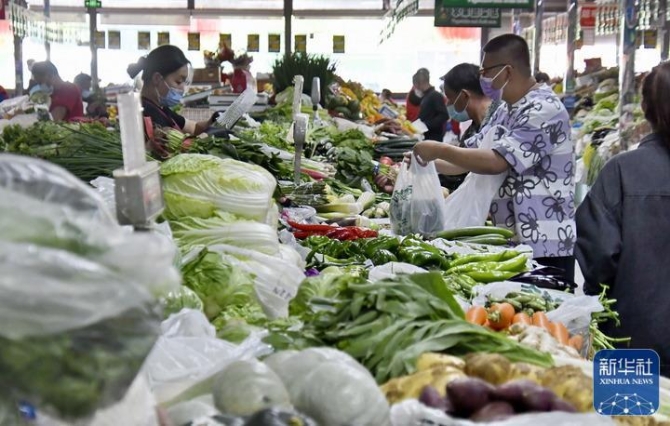 ↑5月13日,市民在北京青年路的菜市场选购蔬菜。新华社记者李欣摄