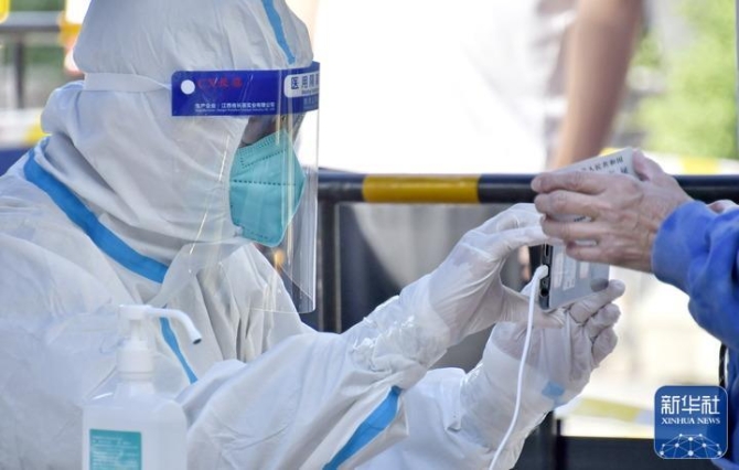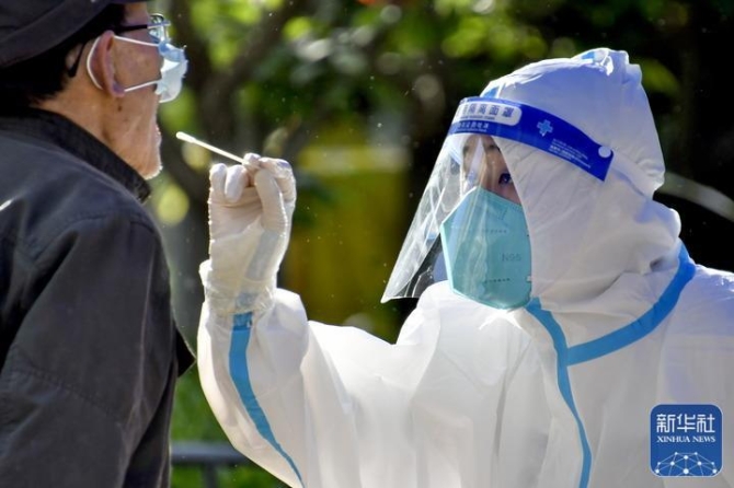 ↑5月13日,一名医护人员在朝阳区八里庄街道朝阳无限社区的检测点为居民做核酸检测。新华社记者 李欣 摄
