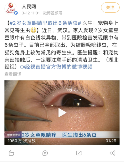 它是一种主要寄生于犬、猫等动物的寄生虫,孩子接触长有线虫的宠物后,未洗干净手直接揉眼,可能导致虫卵寄生于结膜囊内。