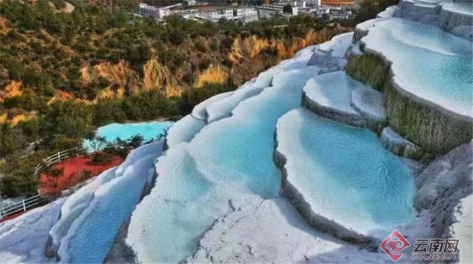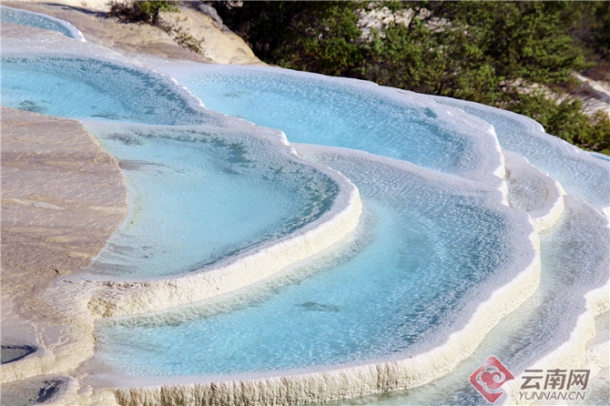 在阳光下形成晶莹耀眼的银屏,竟似千百台迭起的琼台玉阶,又像千百道云波雪浪,自下而上,一台台,一层层,堆云凝雪,纯白如脂,莹润如玉,纤尘不染。近看,仿佛一叠晶莹剔透的玉碗,盛着淡蓝色的琼浆,泉水越过银埂玉丘,沿着坡面缓缓流下,恰似流云倾泻。