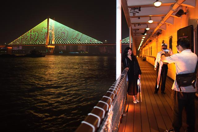 5月18日,游客在船上拍摄长江边的灯光秀。新华社记者 肖艺九 摄