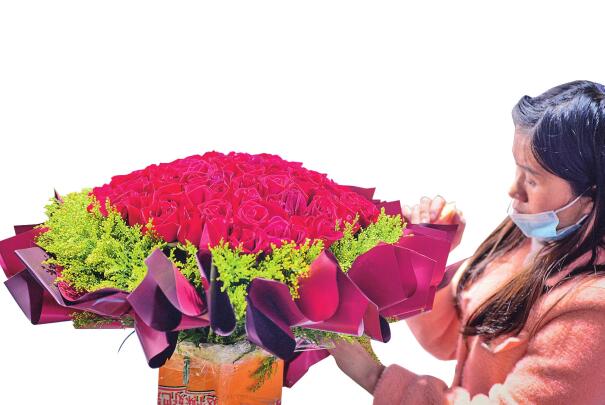 还没有到5月20日,斗南花市内,不少商家摆放出大量精致、美观的玫瑰花束,吸引了不少消费者选购、预订。“52朵玫瑰的花束是98元,99朵玫瑰的花束是168元。目前已经接到20余个订单,而且订单还在陆续增加。”花市内一花店负责人李女士告诉记者,她在花中加了保鲜液,花束存放时间较长。