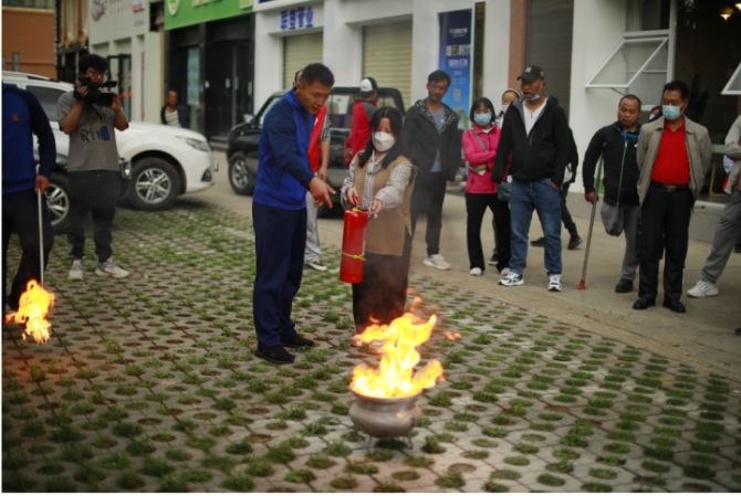 “使用灭火器之前先摇一摇,观察风向,喷射时保持2至5米的距离……”学习了解了防灭火知识后,大家来到比较宽敞的空地里,在玉龙县消防救援大队消防指战员的实际操作示范下,学习灭火器材的使用方法,并进行实际操作演练。