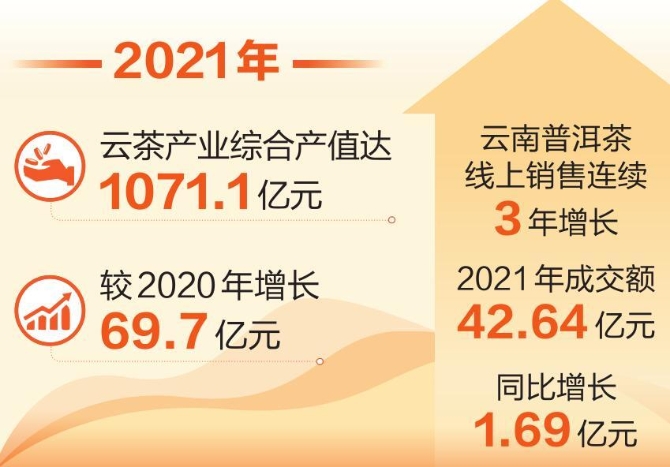 记者近日从云南省茶叶流通协会获悉,继2020年我省实现“千亿云茶产业”目标后,2021年云茶产业继续向好,综合产值达1071.1亿元,较2020年增长69.7亿元。同时,云南普洱茶线上销售连续3年保持增长,2021年成交额达42.64亿元,同比增长1.69亿元。