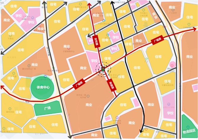 广福路与商盛路地处官渡区西南部,广福路连接了呈贡与主城,是片区东西向主要通道,东向与广卫立交衔接转换各向车流,西向与主城相连,可实现与彩云北路的衔接转换;北向道路安和路是片区组团内南北向生活服务型支路,南向道路商盛路是螺蛳湾商贸城主要进出口,主要承担着螺蛳湾商贸城内部交通与外围道路的主要衔接疏散功能。