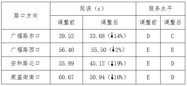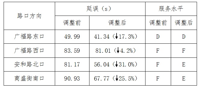 优化方案实施后,广福路与商盛路交叉口各向车辆通行效率普遍得到提升,交叉口总体服务水平有所上升。对比优化调整前,各个路口延误指数均有所下降,其中交叉口的南北安和路—商盛路方向延误指数下降最为明显,全日达19%;高峰时期达31.0%。(数据来源于高德智慧交通公共服务平台)