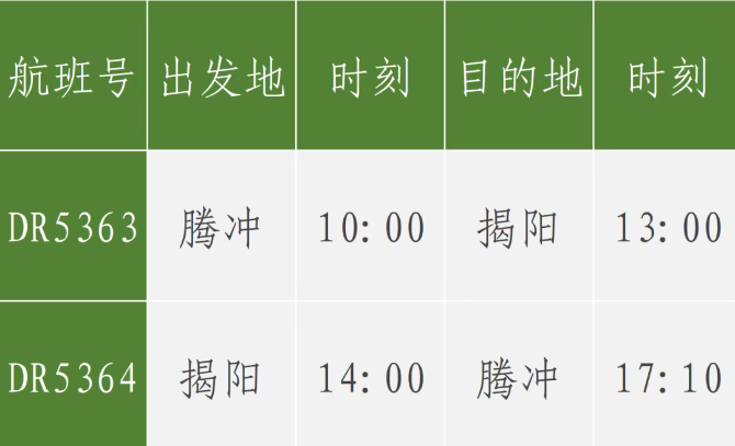 “腾冲=揭阳”航班班期计划为每周二、四、六执飞,航班信息如下: