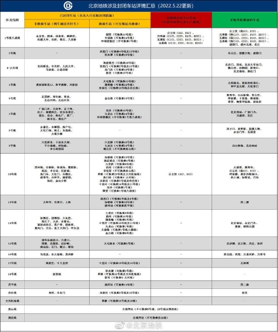 据@北京地铁,根据疫情防控工作需要,在前期运营调整的基础上,自2022年5月23日(星期一)首班车起至另有通知时止,地铁将新增部分车站采取封站、部分出入口封闭措施或启动查验健康码措施。为方便乘客查看,现将涉及封闭及查验健康码的相关车站详情汇总如图(自2022年5月23日首班车起启用)。