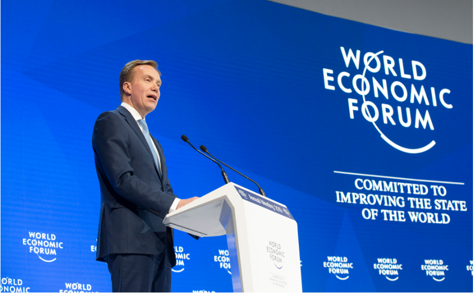 这是2019年1月25日,在瑞士达沃斯,世界经济论坛总裁博尔格·布伦德在论坛年会上致闭幕辞。新华社记者徐金泉摄
