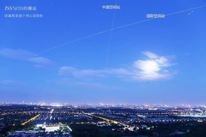 北京西山国家森林公园上空,中国空间站邂逅国际空间站。(网友浩淼之星耿夏 摄)