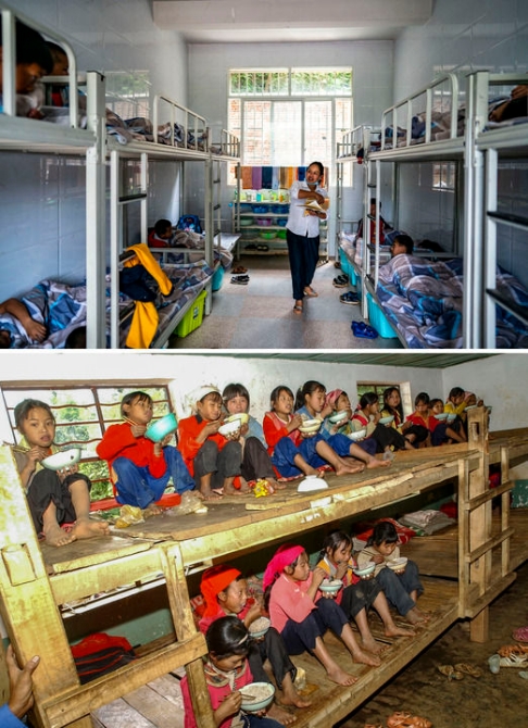 拼版照片:上图为2021年9月8日,云南省澜沧拉祜族自治县木戛乡哈卜吗村小学的学生在宿舍休息(新华社记者江文耀摄);下图为2003年,哈卜吗村小学的学生在宿舍吃饭(新华社记者秦晴摄)。新华社发