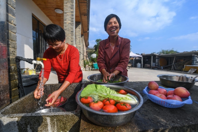 浙江省杭州市临安区天目山镇九狮村村民在家门口洗菜(2020年10月10日摄)。新华社记者 徐昱 摄