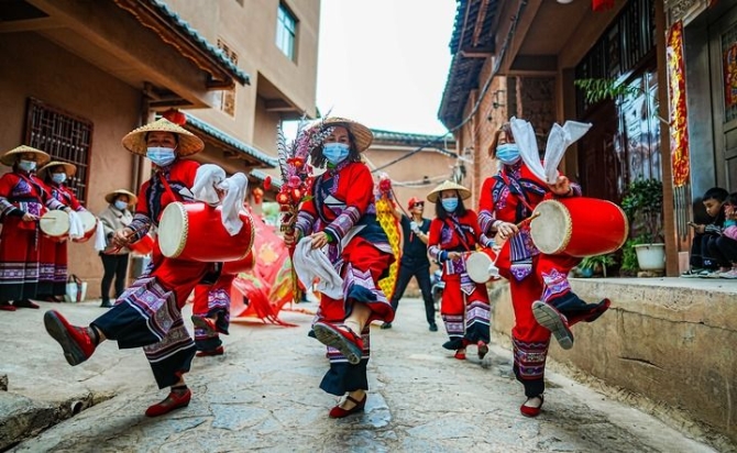 云南省昆明市晋宁区福安村村民在村里一年一度的民俗活动上表演舞蹈(2022年4月5日摄)。新华社记者 江文耀 摄