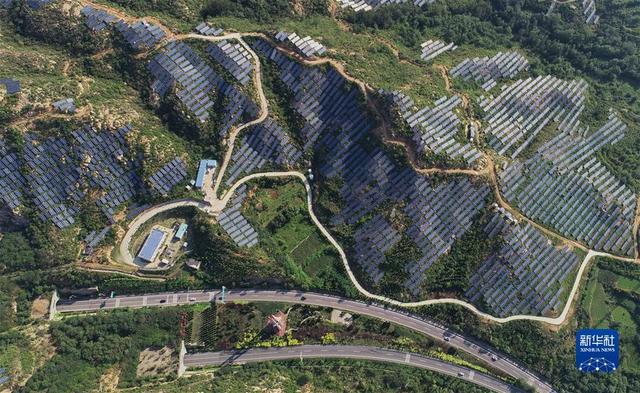 通往西柏坡的高速公路和西柏坡镇一处荒山上的光伏发电场(2019年8月16日摄,无人机照片)。新华社记者 杨世尧 摄
