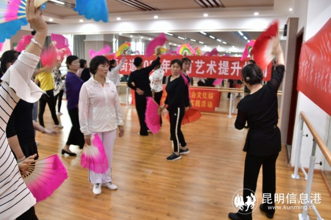 花灯剧是云南群众喜闻乐见的民间歌舞小戏,花灯演出的踪迹可追溯到数百年前。在另一边的花灯歌舞培训现场,学员与艺术家随乐起舞,一把把挥舞的握扇构成了一幅古色古香的画面。艺术家多次亲身示范,认真教授舞步要领,纠正唱腔发音。在耐心指导下,学员们逐渐掌握技巧、跟上步伐,在现场生动演绎了云南花灯剧《十大姐》和云南花灯演唱《买得头巾心欢畅》。