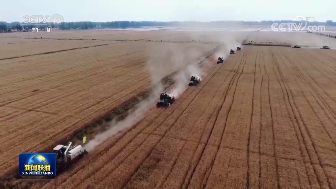 今天的夏粮主产区麦浪滚滚、机声隆隆,呈现出一派丰收景象。