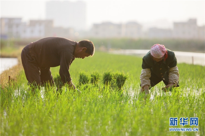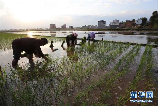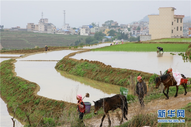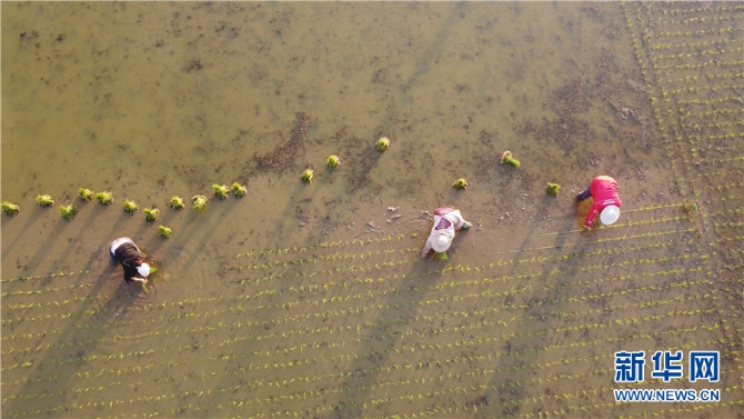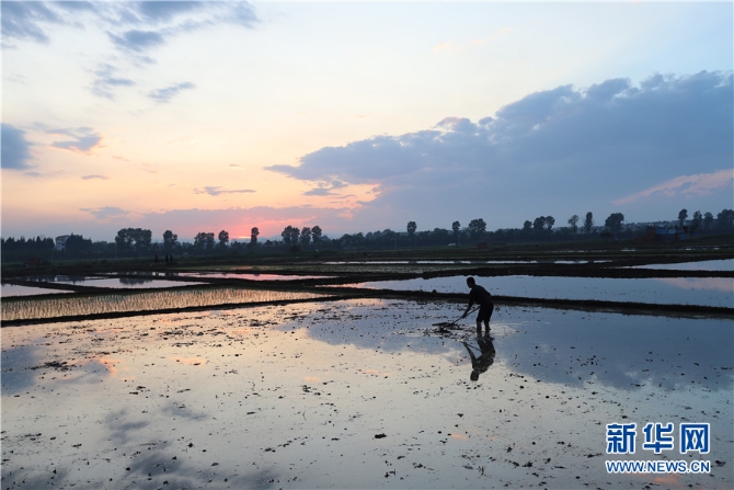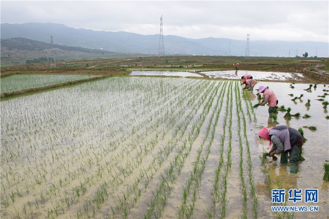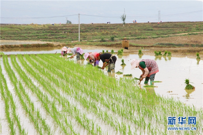 夏日,云南省曲靖市各地进入插秧季,农民抢抓农时开渠灌田、耕田备种。起苗、插秧,秧苗被一点点地插满了水田,低头便可见其中倒映的蓝天和白云,一派繁忙景象。新华网发(杨俊鹏 摄)