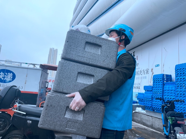 线上订单量持续升高,很多盒马门店配送小哥满负荷上路。