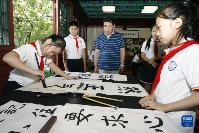嘉宾在观看北京海淀区民族小学书法社团活动(2019年5月29日摄)。新华社记者 刘莲芬 摄