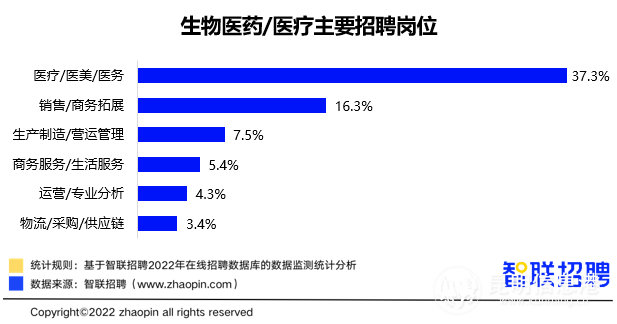 就不同岗位来看,医疗/医美/医务职业占整体招聘职位数的37.3%,排名第一。其次是销售/商务拓展,占比达到16.3%。这两大职业与生产制造/营运管理、商务服务/生活服务、运营/专业分析、物流/采购/供应链等共6类岗位,占据整体职业需求的74.2%。在生物医药/医疗领域,专业性医疗类岗位的招聘需求最高,其次是销售、制造、运营、供应链等职位,行政、人事等职能性岗位需求占比不到3成。