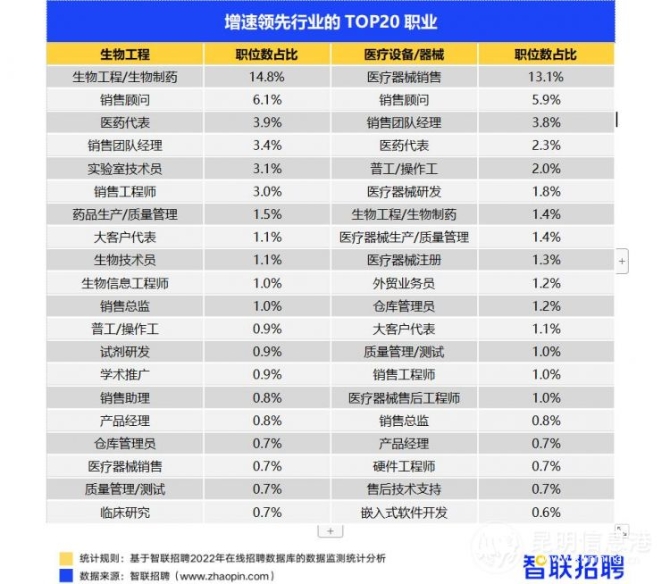 生物工程行业,职位需求占比第一的是生物工程/生物制药,占比达到14.8%。医疗设备/器械的职位需求占比排名第一的是医疗器械销售,占比达13.1%。此外,销售顾问、医药代表、销售团队经理等销售型岗位在两个行业中均排在前列。