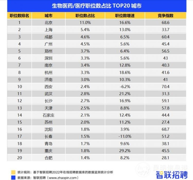 从城市维度看,在生物医药/医疗职位数占比排名TOP20的城市中,北京职位数最多,占比达11%,其次是上海,占比达5.4%,成都超过广州和深圳,以4.6%的占比位列第三。从竞争指数来看,上海的竞争指数为33.7,明显小于北京和成都的68.6、60.4,求职者可重点关注上海的行业机会。此外,郑州也有较多生物医药岗位,从2000年起郑州就开始布局生物医药产业园,目前产业已经形成一定规模。