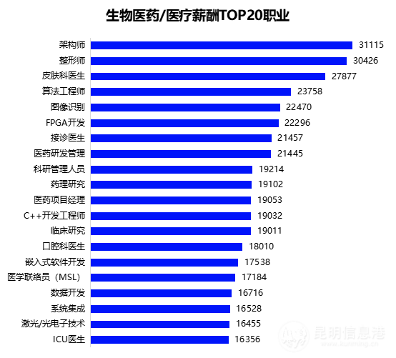 生物医药/医疗薪酬TOP20职业中,平均招聘薪资排名第一的架构师,月收入达31115元/月,其次是整形师(30426元)、皮肤科医生(27877元)、算法工程师(23758元)。从上榜职业来看,高技术型岗位平均招聘薪酬更高。