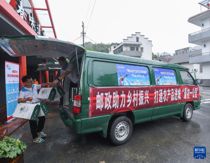 6月1日,在湖源乡村播馆门口,党员志愿者将装有灰汤粽等特色农产品的“湖源山礼”礼盒装车,销往外地。