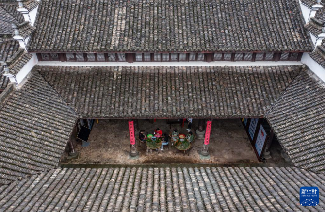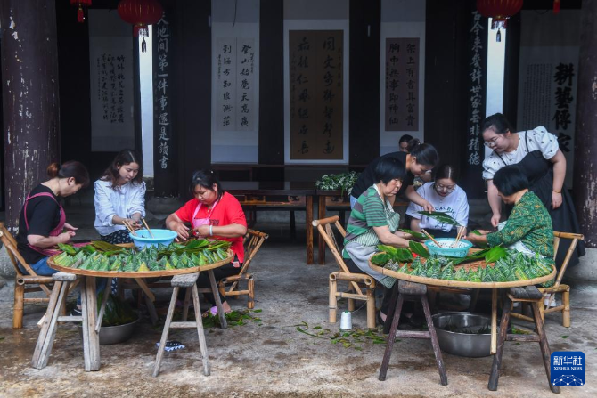 6月1日,在湖源乡窈口村的老台门古建筑里,村民和党员志愿者共包灰汤粽。