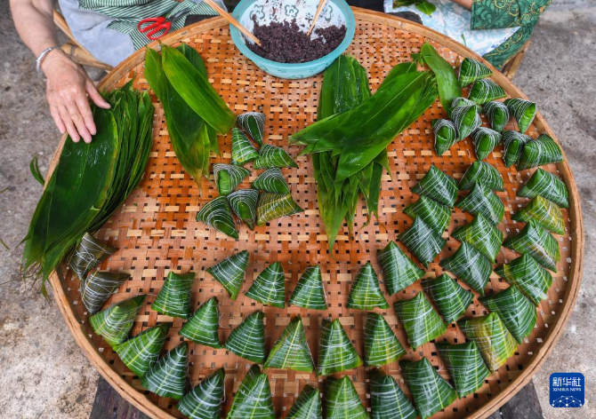 端午临近,浙江省杭州市富阳区湖源乡窈口村的村民们开始包传统的灰汤粽。灰汤粽是当地传统手工美食,取干净稻草烧灰泡汁过滤,糯米经灰汁浸泡后包裹成粽,口感细腻,别具清香。
