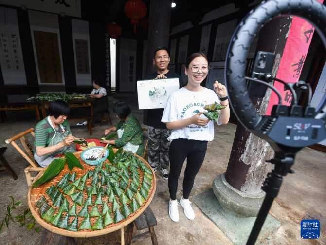 6月1日,在湖源乡窈口村的老台门古建筑里,党员志愿者在网上推介灰汤粽和“湖源山礼”礼盒。