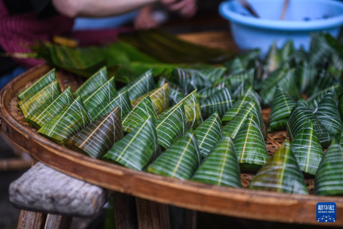 端午临近,浙江省杭州市富阳区湖源乡窈口村的村民们开始包传统的灰汤粽。灰汤粽是当地传统手工美食,取干净稻草烧灰泡汁过滤,糯米经灰汁浸泡后包裹成粽,成品呈金黄色,口感细腻,别具清香。