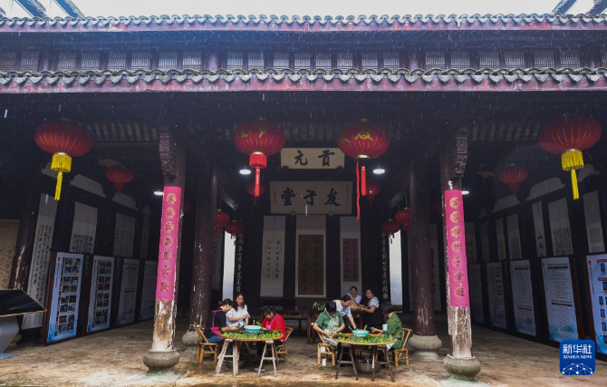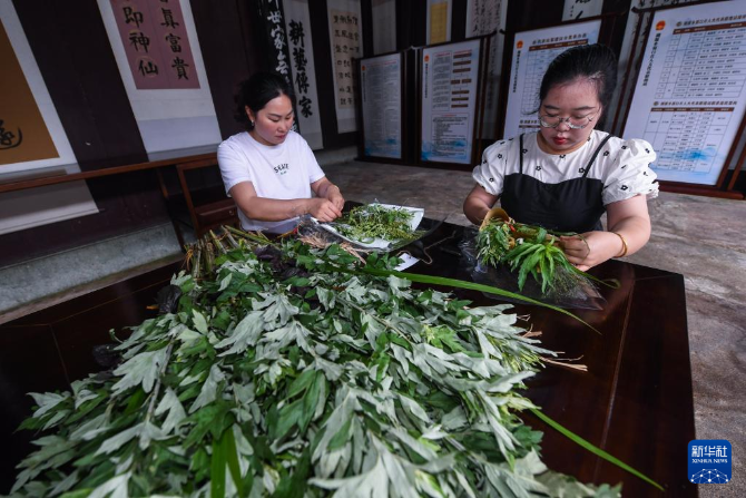 6月1日,在湖源乡窈口村的老台门古建筑里,村民和党员志愿者在一起制作端午艾草伴手礼,准备放进礼盒,作为特色农产品进行销售。