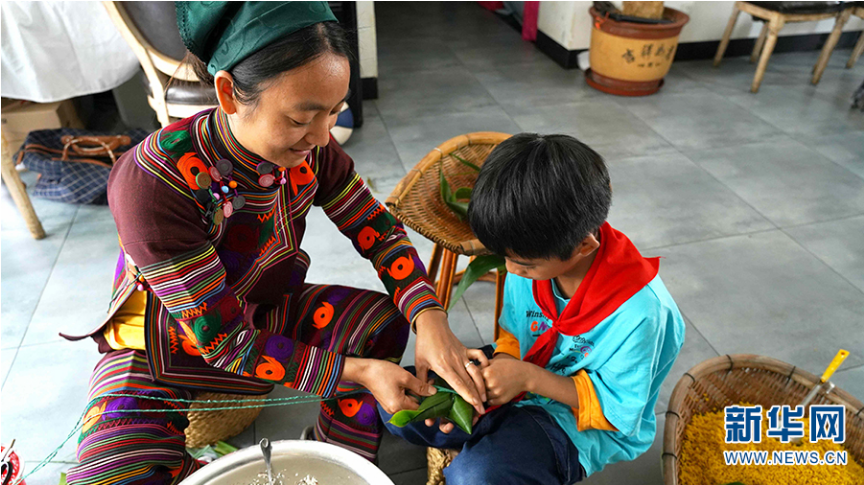 曹俏们在教小孩包粽子(摄于5月24日)。新华网发(胡文 摄)