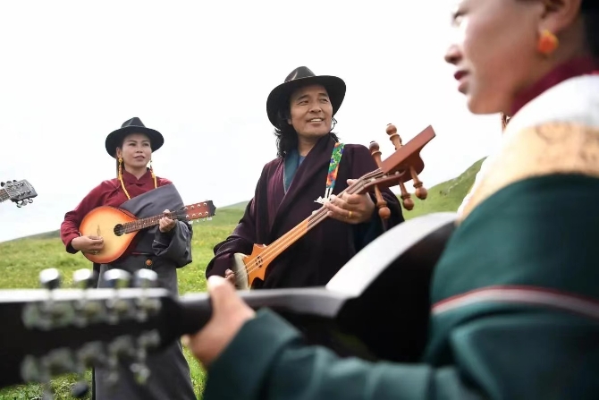 格萨尔弹唱艺人在草原上弹唱格萨尔。新华社记者 陈斌 摄
