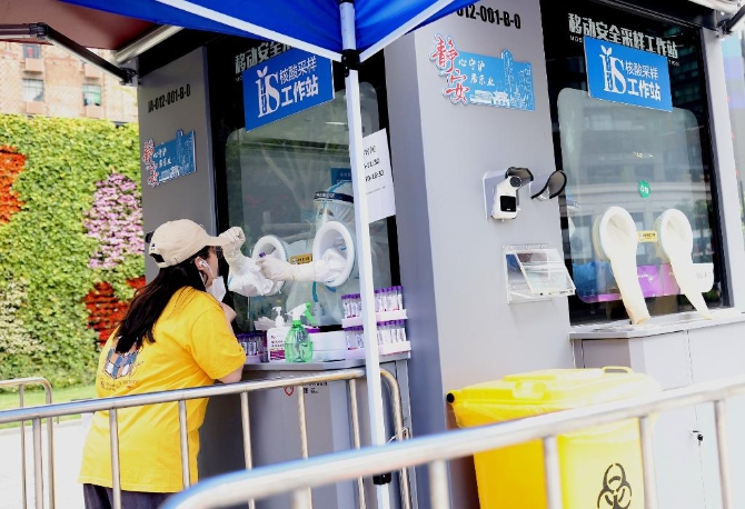6月1日,市民在上海市南京西路一处常态化核酸采样点进行核酸采样。新华社记者 陈飞 摄