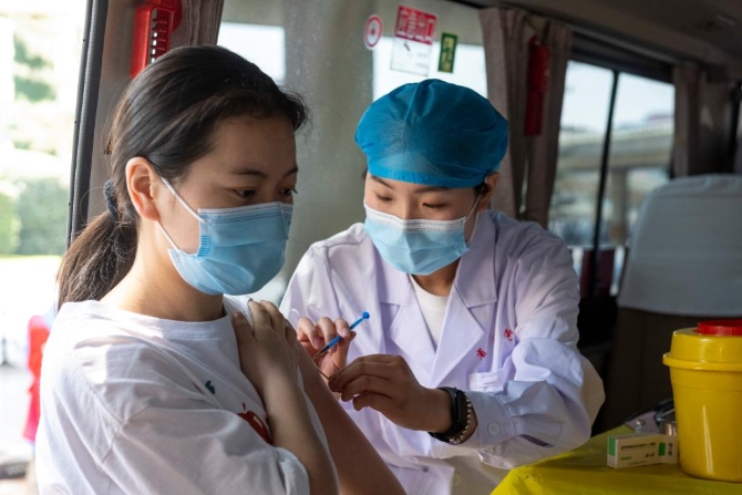 5月20日,在河南省郑州市金水区花园路与金水路交叉口,市民在新冠疫苗接种车上接种疫苗。新华社记者 徐嘉懿 摄