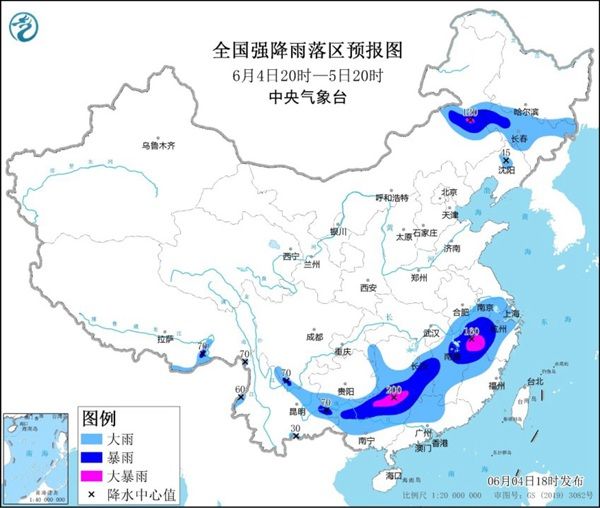 预计,6月4日20时至5日20时,贵州南部、湖南中南部、江西大部、安徽南部、浙江中西部、福建西北部、广东北部、广西中北部、云南东部以及内蒙古东南部、吉林大部等地的部分地区有大到暴雨,其中,广西东北部、湖南西南部、江西东北部等局地有大暴雨(100~200毫米);上述部分地区伴有短时强降水(最大小时降雨量30~60毫米,南方局地可超过80毫米),局地有雷暴大风等强对流天气。