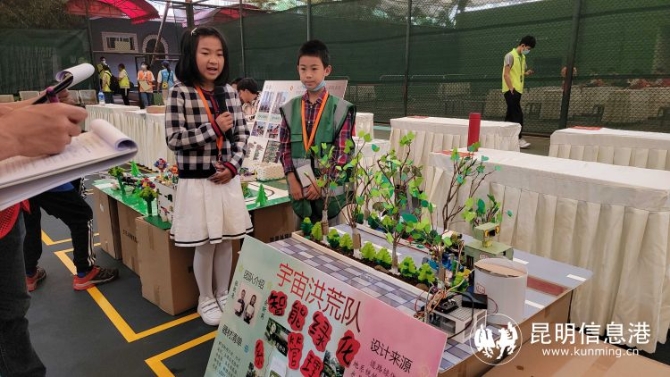 颁奖仪式上,文林小学的张钦尧、师大附小的佘昕芮这两位四年级的选手联合设计的“智能绿化管理系统”获得了智能物联网主题赛(小学组)第一名。“大家可以看到,这套模型配备了RFID射频识别、红外遥控、土壤湿度检测传感器等装置,可实时监控植物的生长情况,智能绿化机器人还能及时进行浇灌、修剪等绿植管养,为人类分担部分工作。”张钦尧告诉记者,他和搭档发现昆明道路绿化范围非常广,但工作人员的管理和养护工作复杂又辛苦,为了提高其工作效率和绿植存活率,他们拟定大纲、选定题目、走访调研,并利用课余时间制作模型,历时三个月完成了作品。