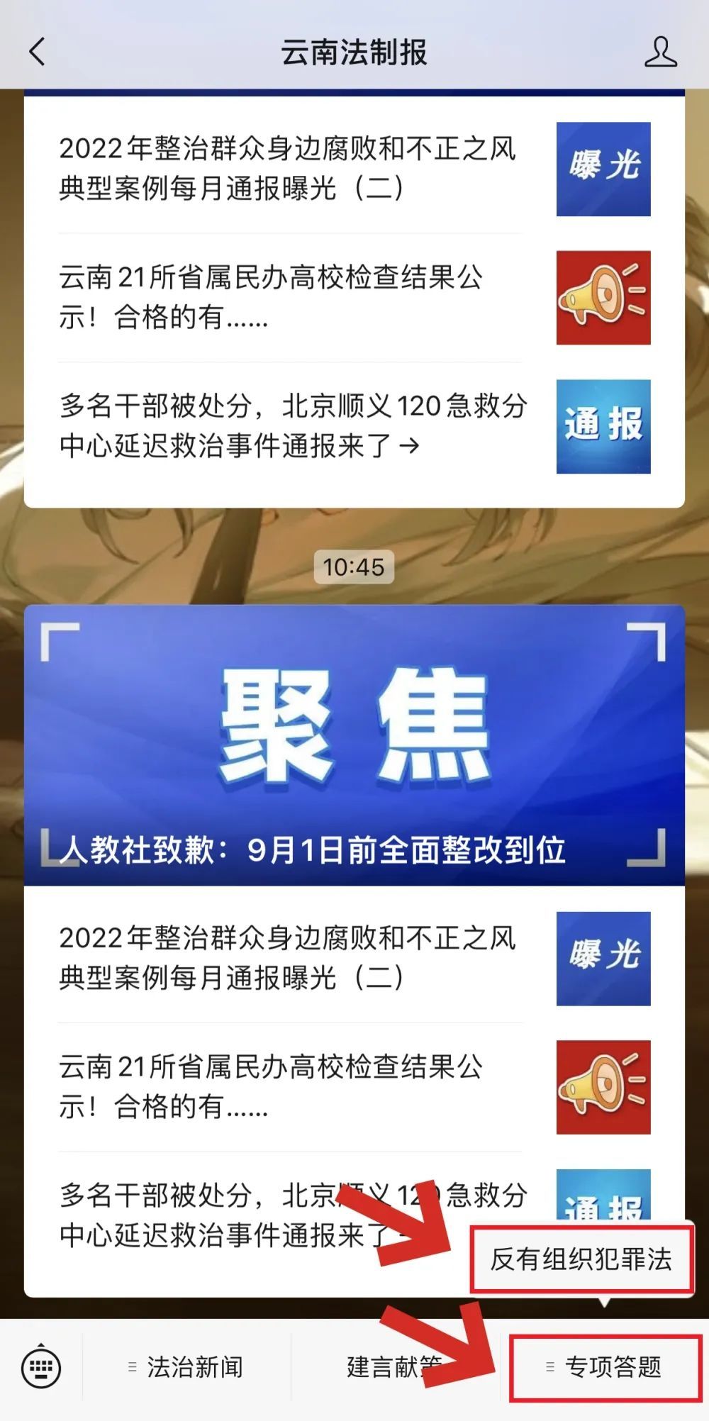 2. 进入“云南法制报”公众号主页,点击菜单栏【专项答题】-【反有组织犯罪法】进入答题页面。