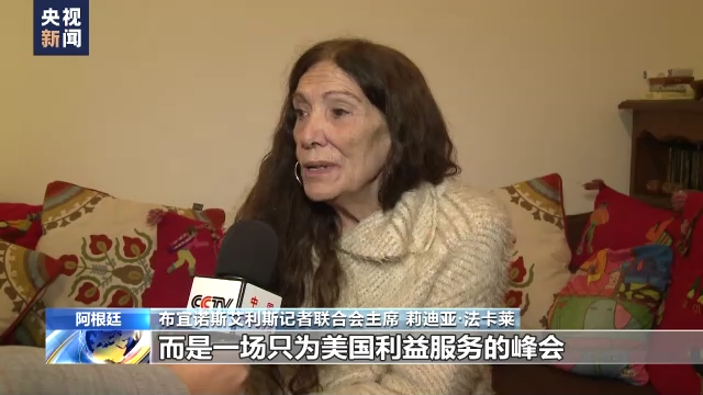 布宜诺斯艾利斯记者联合会主席 莉迪亚·法卡莱:我觉得美国的做法很荒谬。这样的美洲峰会就不是一场峰会了,也不是什么美洲国家的峰会,而是一场只为美国利益服务的峰会。我认为任何一个拉美国家都无法从中受益,(部分国家未被邀请)完全是出于意识形态的原因。这些被排除的国家保持着反帝国主义,反干涉主义和捍卫本国主权的历史文化,我认为这是完全正确的,这也是美国将他们排除在美洲峰会之外的原因。