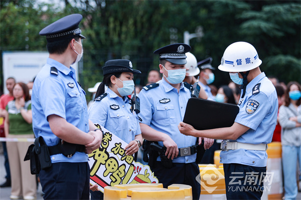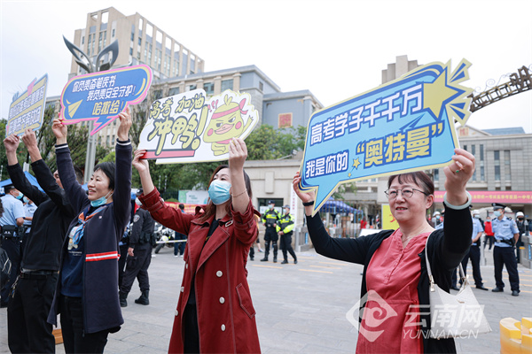 “高考顺风又顺水,把把超神上大分”“高考学子千千万,你是我的‘奥特曼’”……昆一中考点前,昆明市公安局五华分局龙翔派出所的警官们手举一系列“高考加油”的牌子为现场考生加油。龙翔派出所所长甘德武介绍,派出所的90后警官特意找了一些孩子们喜闻乐见的网络热词,制作成加油牌匾,用轻松的方式给考生加油打气。此外,龙翔派出所户籍窗口开通了绿色通道。高考期间窗口7:00准时上班,针对考生遗忘身份证或身份信息无法识别等情况,及时办理好临时身份证,并由专人送到考点,确保考生按时进入考场。