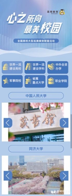 本次活动由中国城市网站联盟指导,昆明日报社、“昆明教育”微信公众号、昆明信息港彩龙社区联合发起,邀请高校师生和摄影爱好者通过影像作品为自己心中的最美校园“代言”。活动历时一个月,吸引了浙江大学、同济大学、中国人民大学等近200所高校师生参与其中,用上万幅美图展示了各高校内外兼修的独特魅力。