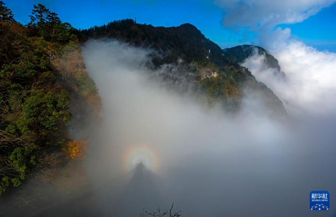 峨眉山景区雷洞坪的“佛光”景观(2015年10月18日摄)。“佛光”是由于阳光照在云雾表面,经过衍射和漫反射作用而形成的自然景观。新华社发(孔胜 摄)
