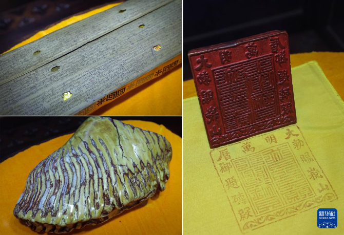 珍藏在峨眉山景区万年寺的“三宝”:贝叶经(左上)、佛牙(左下)和御印(6月6日摄,拼版照片)。新华社记者 江宏景 摄
