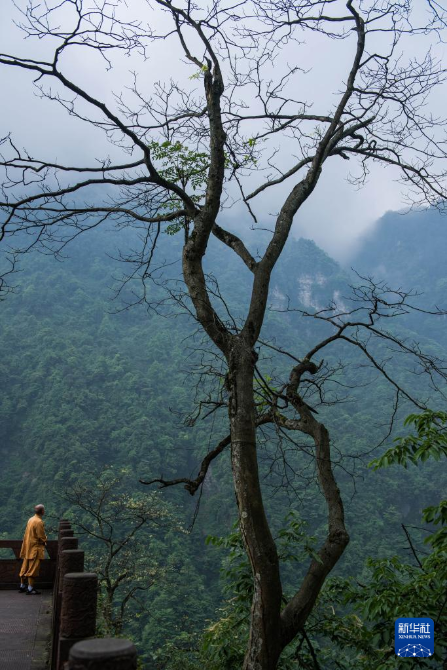 在峨眉山景区遇仙寺,一位僧人远眺群峰(5月18日摄)。新华社记者 江宏景 摄
